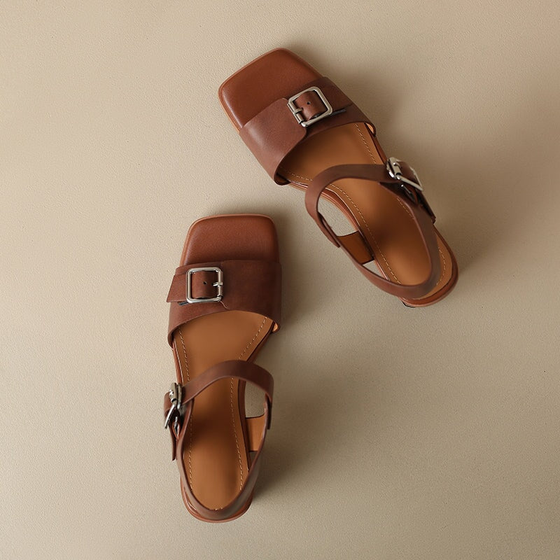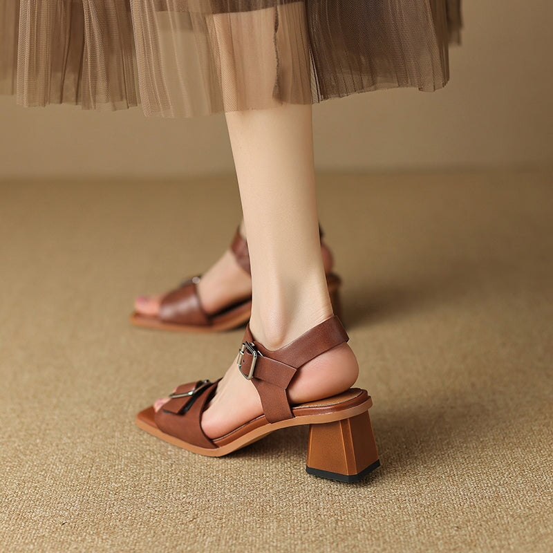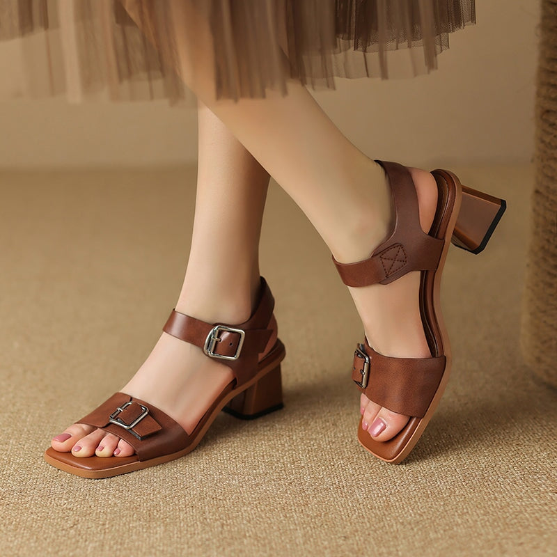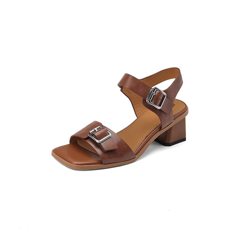 Step into effortless summer elegance with these open-toe leather sandals. Crafted from premium cowhide leather, they feature a modern square toe, stylish metal buckle accents, and a comfortable 50mm block heel. The open heel and breathable design make them perfect for warm-weather wear, while the rubber outsole provides grip and stability for all-day comfort.