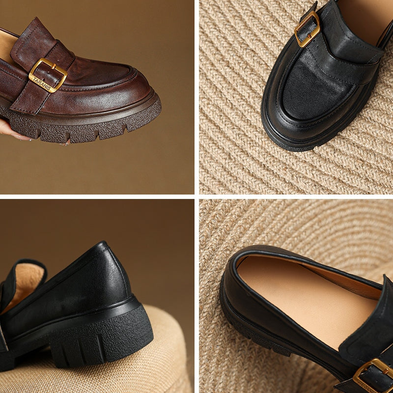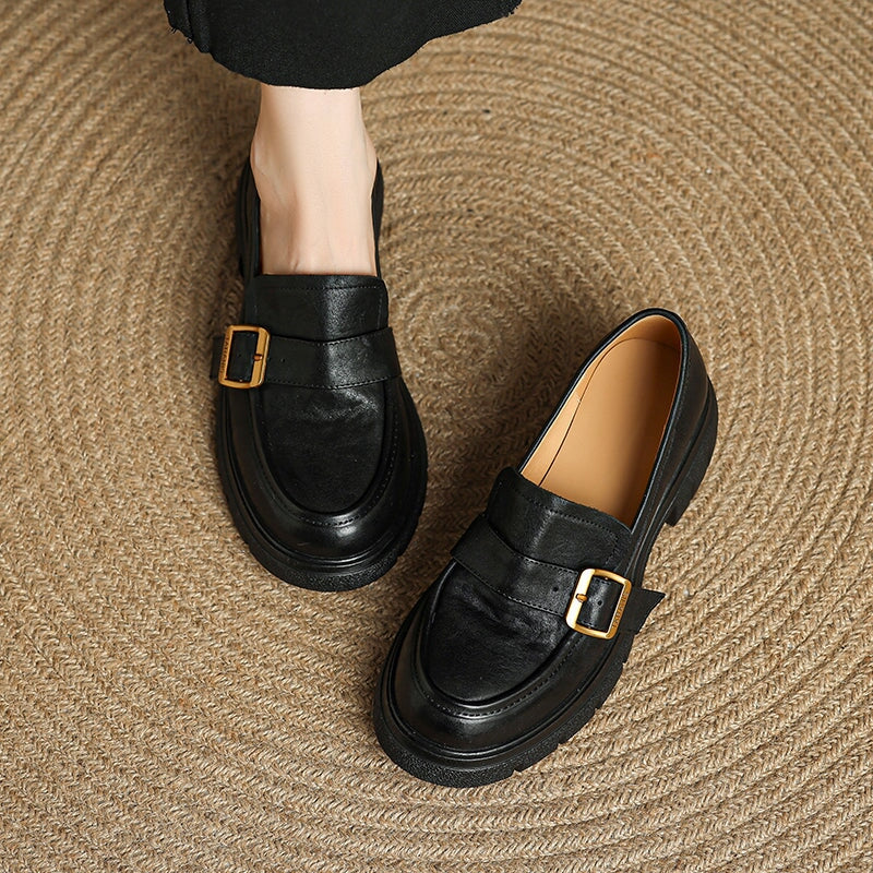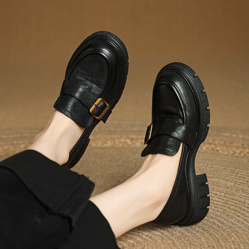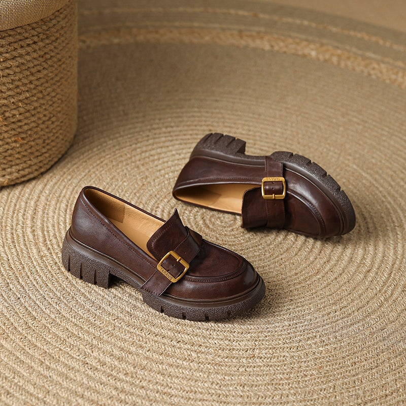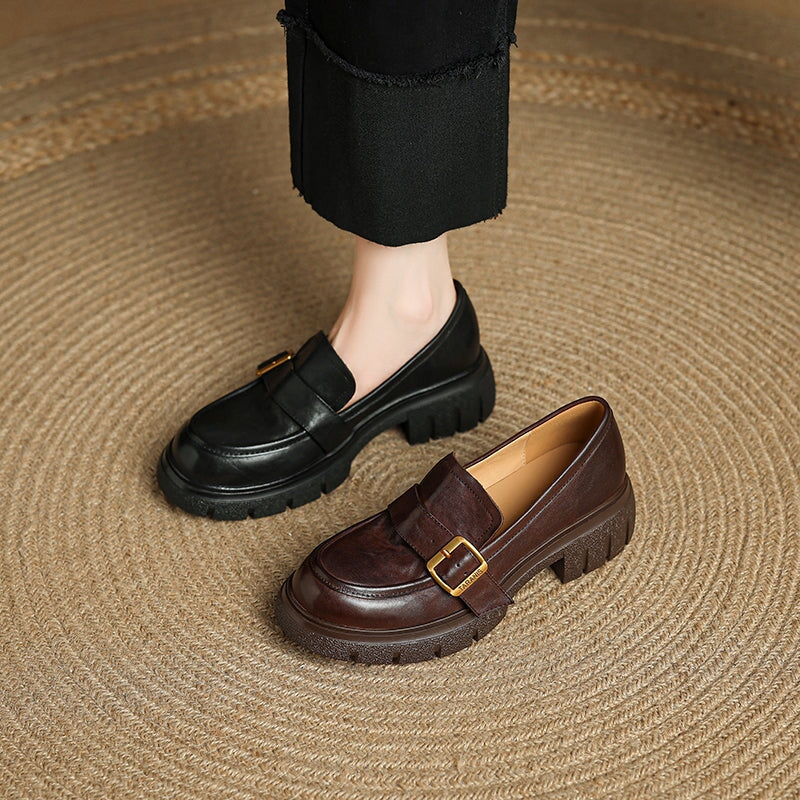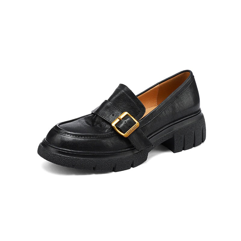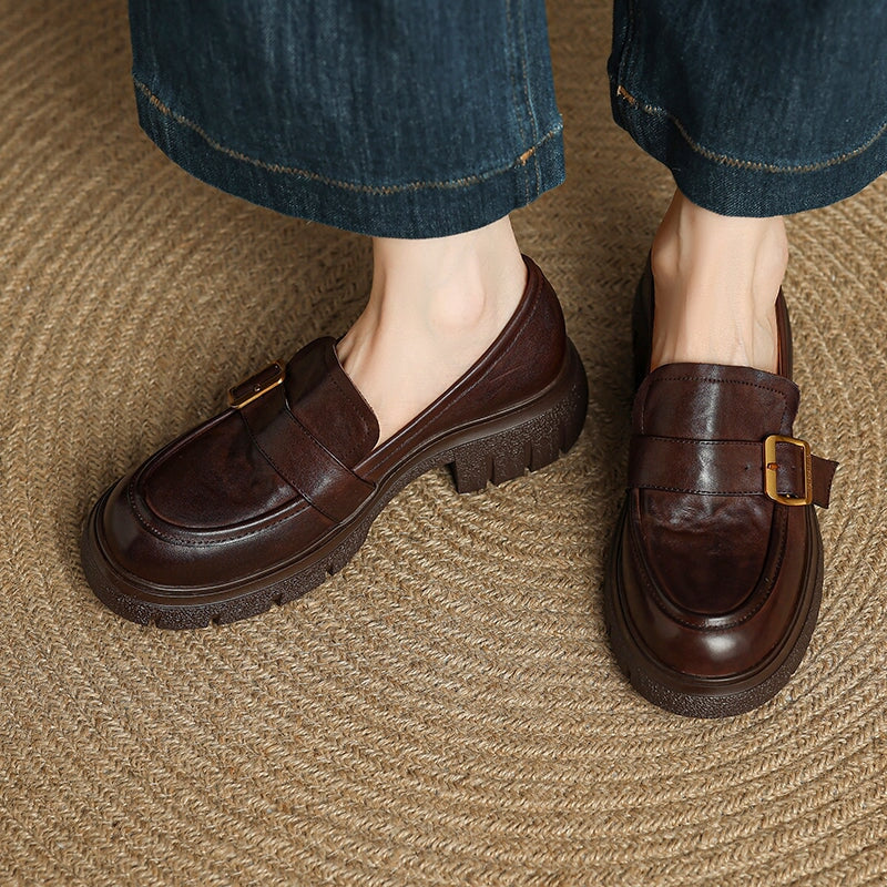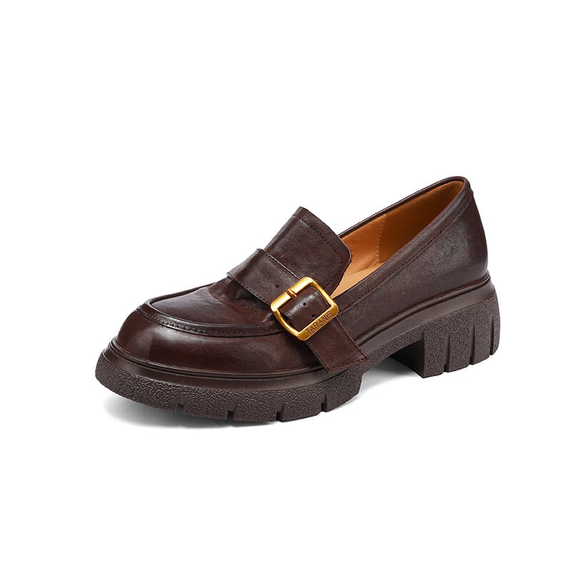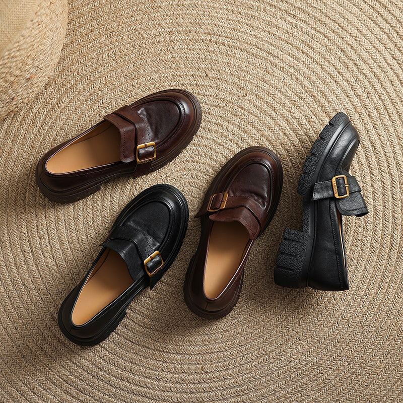 These vintage-inspired platform loafers are crafted from premium full-grain washed cowhide leather, offering a soft yet durable feel with a naturally aged look. Featuring a round toe, stylish metal buckle, and a stable 50mm block heel, they provide both comfort and height. The rugged rubber outsole adds excellent grip, making them perfect for casual daily wear. A retro-meets-modern design that pairs effortlessly with jeans, skirts, or office outfits.
